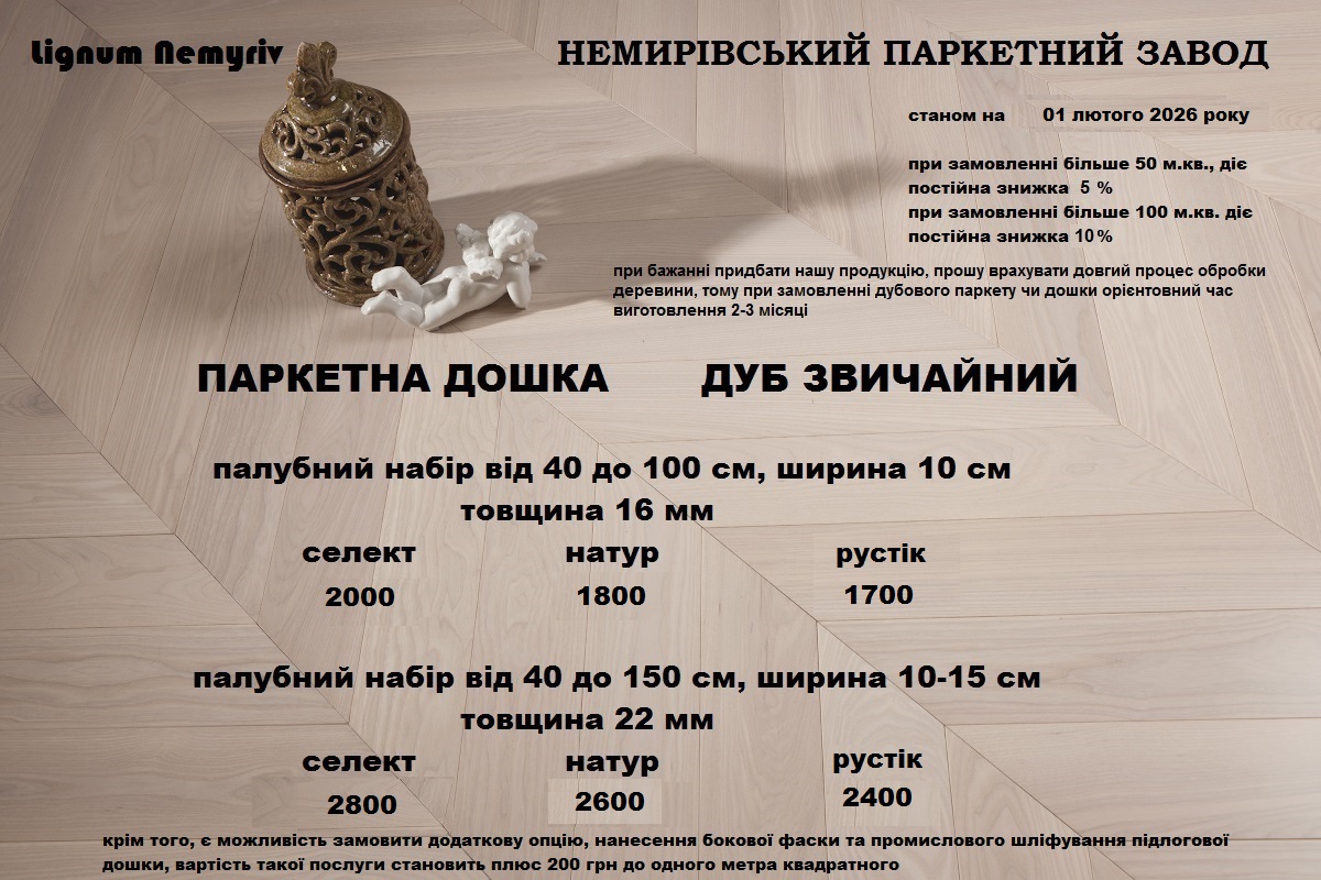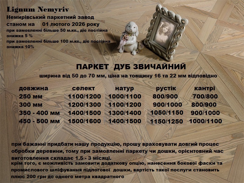 В описі до товару зазначено вид деревини, його сортність, довжина, ширина, товщина та ціна за продукцію товщиною 16 мм та 22 мм відповідно, крім того, на постійній основі діє знижка, при замовленні більше 50 м.кв. 5%, при замовленні більше 100 м.кв. 10%